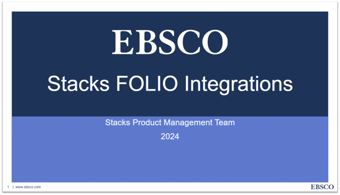 Sample Search Terms The politics of Harry Potter Star Wars Slide Presentation PowerPoint presentation explaining the relationships between Stacks and FOLIO offered by this integration. Accessible to anyone with EBSCO Industries access in Sharepoint. Dashboard Configuration View the settings required to connect a FOLIO tenant to Stacks Features and Roadmap See the connections we're building between Stacks and FOLIO